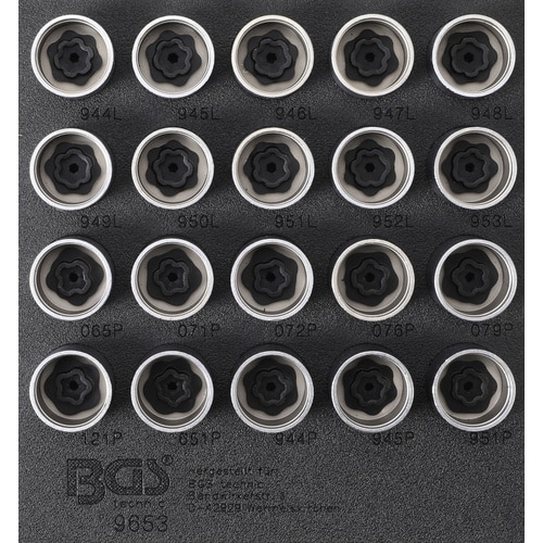 Der BGS Technic Werkstattwagen-Einlage Felgenschloss-Werkzeug-Satz im Detail