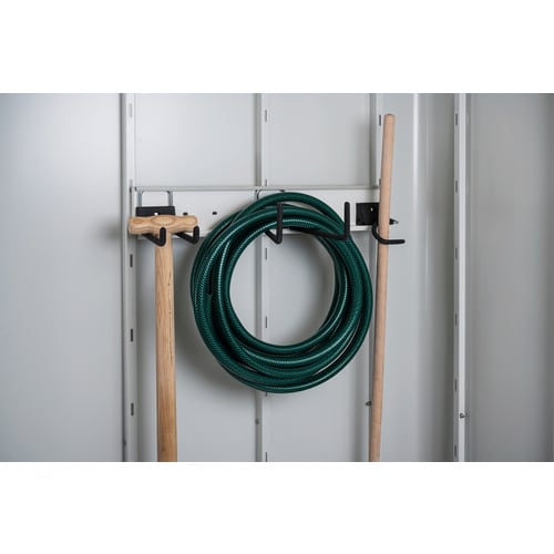 Das Set besteht aus verschiedenen Hakenformen und -größen, sodass Sie Ihre Gartengeräte, Werkzeuge, Fahrräder und vieles mehr optimal verstauen können. Ob Spaten, Rechen, Heckenschere oder Gartenschlauch – jeder Gegenstand findet seinen festen Platz. Und das Beste daran: Sie können die Haken ganz nach Ihren individuellen Bedürfnissen an den Innenwänden des Gerätehauses anbringen. So schaffen Sie ein maßgeschneidertes Ordnungssystem, das perfekt auf Ihre Anforderungen zugeschnitten ist.