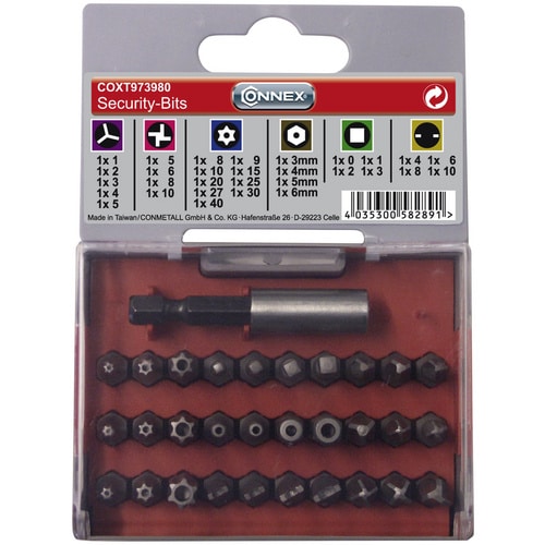 Der CONNEX Bitsatz »Security« enthält eine Vielzahl von Spezialbits, darunter Torx, Inbus, Tri-Wing, Spanner und viele weitere. Eine detaillierte Auflistung der enthaltenen Bits finden Sie in der Produktbeschreibung oder auf der Verpackung.