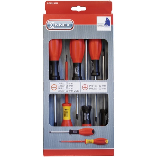 Der CONNEX Schraubendrehersatz enthält eine Auswahl an Schraubendrehern mit Längsschlitz- und Phillips- (PH) Spitzen. Diese Kombination deckt die gängigsten Schraubentypen ab und macht das Set zu einem vielseitigen Werkzeug für eine Vielzahl von Anwendungen. Ob Sie Möbel montieren, Elektrogeräte reparieren oder an Ihrem Auto schrauben – mit diesem Set sind Sie bestens ausgerüstet.