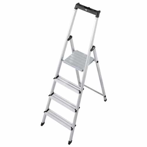 - Sicherheit: Breite, geriffelte Stufen und rutschfeste Fußkappen sorgen für einen sicheren Stand.