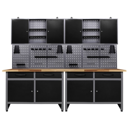 Die Werkzeugwand bietet dir die Möglichkeit, dein Werkzeug übersichtlich aufzuhängen und schnell griffbereit zu haben. Die Werkbank ist mit einer robusten Arbeitsplatte ausgestattet, die auch schweren Belastungen standhält. Der Werkzeugschrank bietet ausreichend Platz für größere Werkzeuge und Zubehör. So hast du alles, was du für deine Projekte benötigst, immer zur Hand.