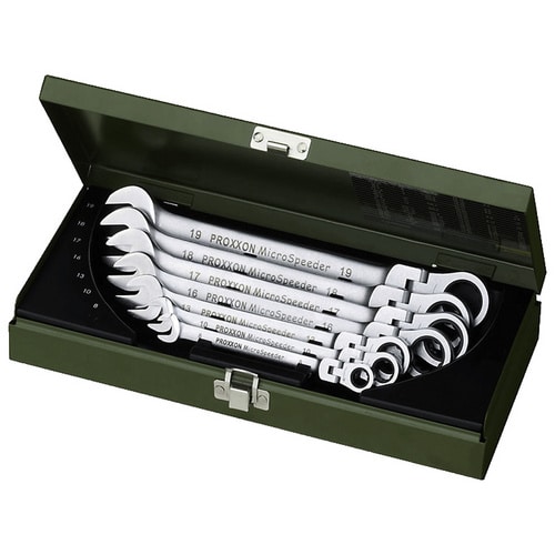 Der PROXXON Microspeeder-Satz enthält die Schlüsselgrößen 8 mm, 9 mm, 10 mm, 11 mm, 12 mm, 13 mm, 14 mm, 15 mm, 16 mm, 17 mm, 18 mm und 19 mm. Damit deckt er die gängigsten Schraubverbindungen ab.